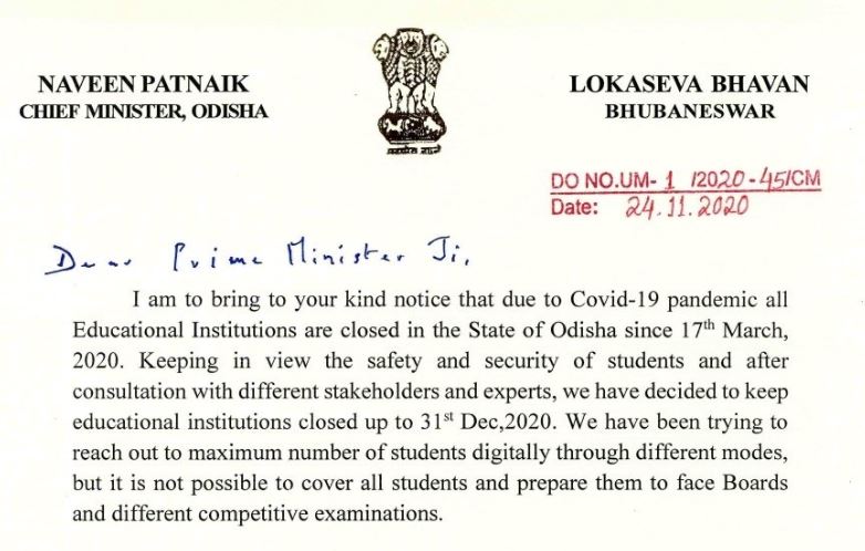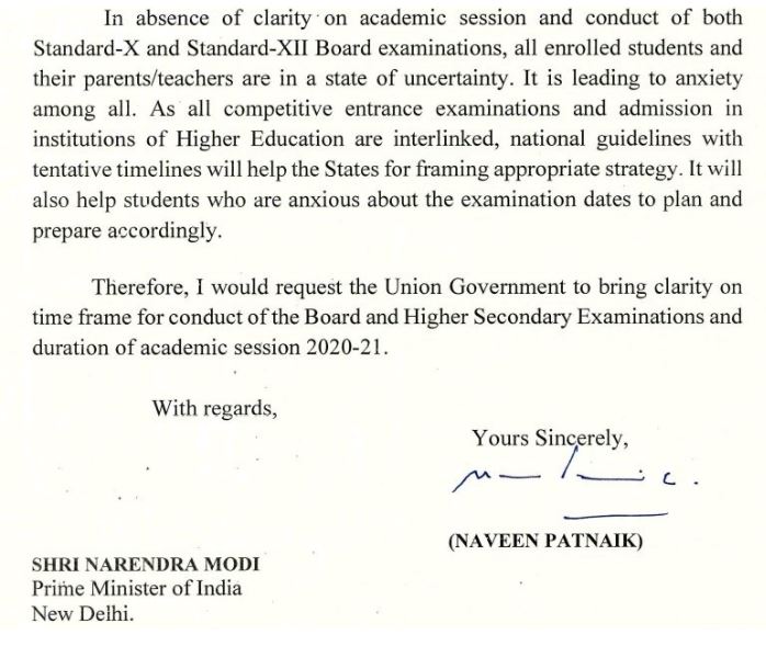 ମୁଖ୍ୟମନ୍ତ୍ରୀ ଚିଠିରେ ଉଲ୍ଲେଖ କରିଛନ୍ତି, ମହାମାରୀ ପାଇଁ ଶିକ୍ଷା ବ୍ୟବସ୍ଥାରେ ଗଭୀର ପ୍ରଭାବ ପଡିଛି । ଚଳିତ ବର୍ଷ ମାଟ୍ରିକ ଓ ଯୁକ୍ତ ଦୁଇ ପରୀକ୍ଷା ପରେ ପରୀକ୍ଷା ଫଳାଫଳ ପ୍ରକାଶ ପାଇବାରେ ମଧ୍ୟ ବିଳମ୍ବ ହୋଇଥିଲା ।