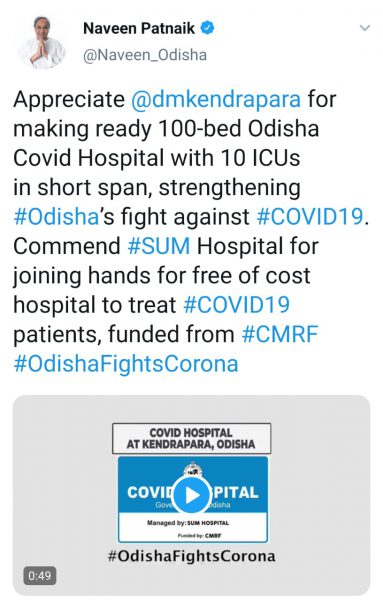 ଭୁବନେଶ୍ୱର : ଖୁବ୍ କମ ସମୟ ମଧ୍ୟରେ କେନ୍ଦ୍ରାପଡାରେ କୋଭିଡ ୧୯ ହସ୍ପିଟାଲ ପ୍ରସ୍ତୁତ ହୋଇଥିବାରୁ କେନ୍ଦ୍ରାପଡା ଜିଲ୍ଲାପାଳ ସମର୍ଥ ବର୍ମାଙ୍କୁ ପ୍ରଶଂସା କରିଛନ୍ତି ମୁଖ୍ୟମନ୍ତ୍ରୀ ନବୀନ ପଟ୍ଟନାୟକ ।