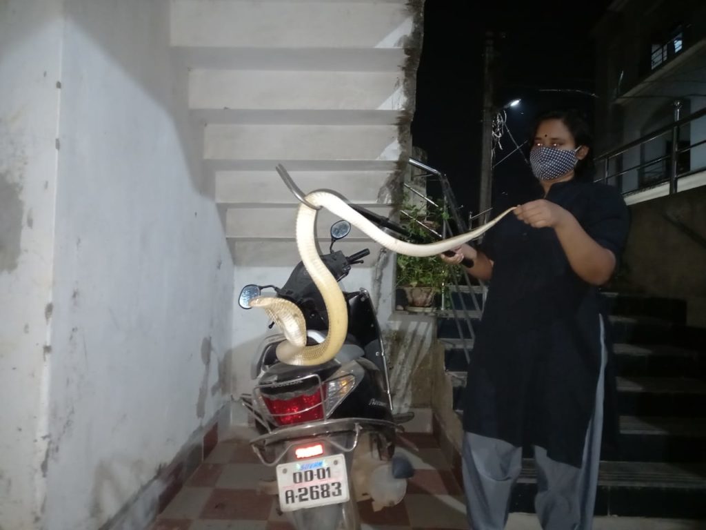 ପ୍ରାୟ ସାଢ଼େ ୪ ଫୁଟ ଲମ୍ବର ନାଗ ସାପ ଟିକୁ ହୋଣ୍ଡା ସ୍କୁଟରରୁ ସ୍ନେକ ହୁକ ସାହାଯ୍ୟରେ ସତର୍କତାର ସହିତ ଉଦ୍ଧାର କରି ବ୍ୟାଗରେ ଭର୍ତ୍ତି କରିଥିଲେ ସ୍ନେକ ହେଲ୍ପ ଲାଇନ ସଦସ୍ୟା ସିଲକା ସେଲୋନୀ ।