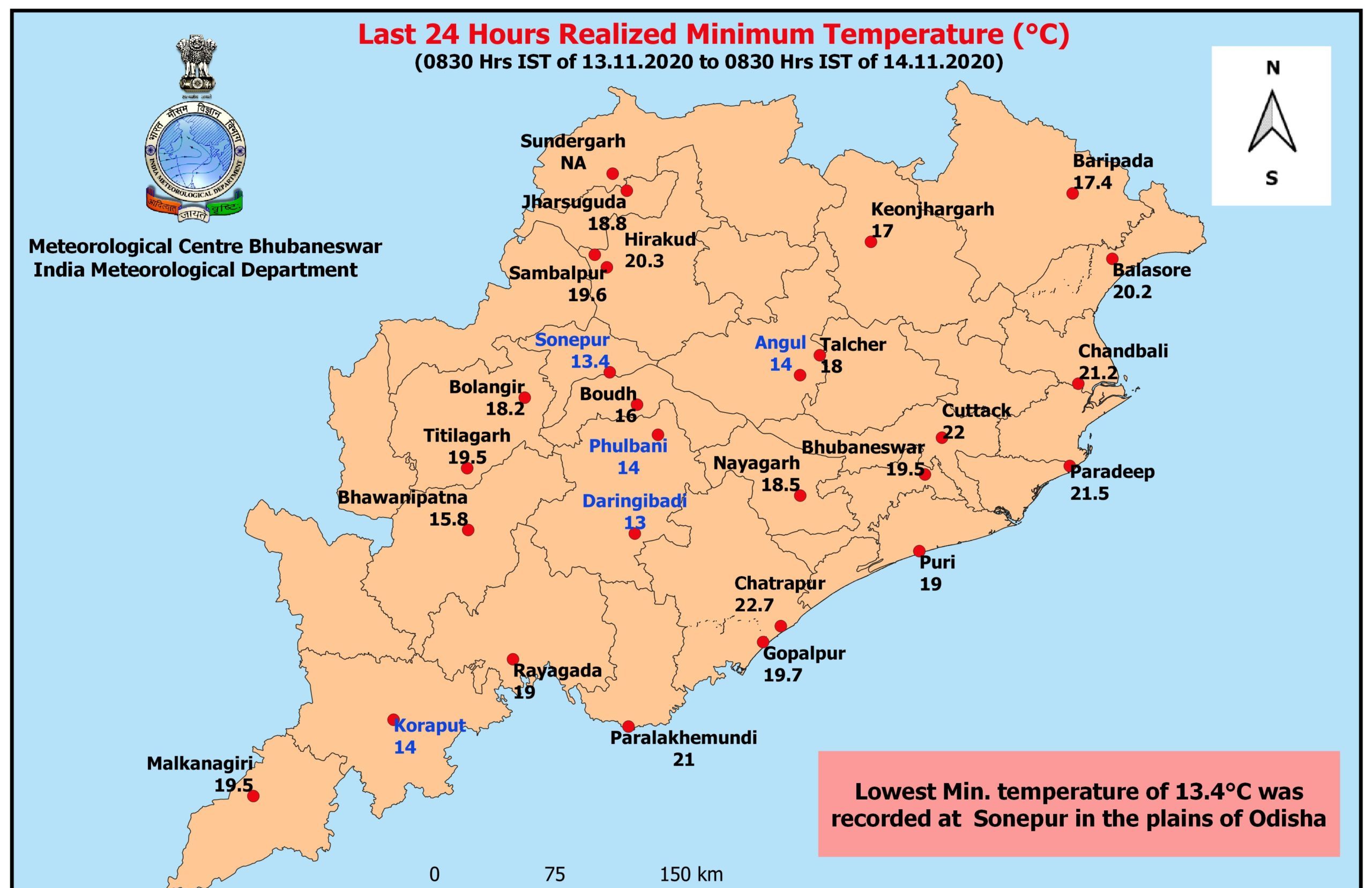 ସେହିପରି ସୋନପୁରରେ ୧୩.୩ ଡିଗ୍ରୀ ସେଲସିୟସ୍ ଏବଂ ଫୁଲବାଣୀ ଓ ଅନୁଗୋଳରେ ୧୪ ଡିଗ୍ରୀ ସେଲସିୟସ୍ ଲେଖାଏଁ ତାପମାତ୍ରା ରହିଥିଲା । ଆସନ୍ତା ଦିନେ ଦୁଇ ଦିନରେ ଓଡ଼ିଶାର ଆଭ୍ୟନ୍ତରୀଣ ଜିଲ୍ଲାଗୁଡ଼ିକରେ ତାପମାତ୍ରା ୩/୪ ଡିଗ୍ରୀ ଓ ଉପକୂଳ ଜିଲ୍ଲାଗୁଡ଼ିକରେ ୨ରୁ ୩ ଡିଗ୍ରୀ ପର୍ଯ୍ୟନ୍ତ ତାପମାତ୍ରା ହ୍ରାସ ପାଇବା ସମ୍ଭାବନା ରହିଛି ।