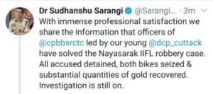 କଟକ: କମିଶନରେଟ ପୋଲିସକୁ ବଡ଼ ସଫଳତା । କଟକ ନୟାସଡକ ସ୍ଥିତ ଫାଇନାନ୍ସ କମ୍ପାନୀରୁ ଟଙ୍କା ଓ ସୁନା ଗହଣା ଲୁଟ୍ ଘଟଣାର ପର୍ଦ୍ଦାଫାସ କରିଛି ପୋଲିସ । ସମସ୍ତ ଅଭିଯୁକ୍ତଙ୍କୁ ପୋଲିସ ଅଟକ ରଖିଛି । ଟ୍ୱିଟ୍ କରି ସୂଚନା ଦେଇଛନ୍ତି ପୋଲିସ କମିଶନର ଡକ୍ଚର ସୁଧାଂଶୁ ଷଡଙ୍ଗୀ ।