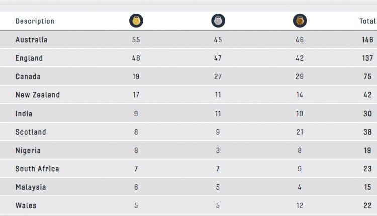 ଭାରତ ଏବେ 9ଟି ସ୍ବର୍ଣ୍ଣ ପଦକ ଜିତିବା ସହ 5 ମ ସ୍ଥାନରେ ରହିଛି । ରାଜ୍ୟଗୋଷ୍ଠୀ କ୍ରୀଡାରେ 9ଟି ସ୍ବର୍ଣ୍ଣ ଭାରତ ଜିତିଥିବା ବେଳେ 11ଟି ରୈାପ୍ୟ ଏବଂ 10ଟି କାଂସ୍ୟ ପଦକ ଜିତିଛି । ତେବେ ପ୍ରଥମ ସ୍ଥାନରେ ଅଷ୍ଟ୍ରେଲିଆ ରହିଛି । ଅଷ୍ଟ୍ରେଲିଆ 55 ଟି ସ୍ବର୍ଣ୍ଣ, 45 ଟି ରୈାପ୍ୟ ଏବଂ 46ଟି କାଂସ୍ୟ ପଦକ ଜିତିଛି । ଦୁଇ ନମ୍ବରରେ ରହିିଛି ଇଂଲଣ୍ଡ  । ଇଂଲଣ୍ଡ 48ଟି ସ୍ବର୍ଣ୍ଣ, 47 ଟି ରୈାପ୍ୟ ଏବଂ 42ଟି କାଂସ୍ୟ ପଦକ ଜିତିଛି  ।  3 ନମ୍ବର ସ୍ଥାନରେ କାନାଡା ଥିବାବେଳେ 4 ନମ୍ବରରେ ନିଉଜିଲ୍ୟାଣ୍ଡ ରହିଛି । କାନାଡାର ସ୍ବର୍ଣ୍ଣ ସଂଖ୍ୟା 19 ଥିବାବେଳେ ନିଉଜିଲ୍ୟାଣ୍ଡର ସ୍ବର୍ଣ୍ଣ ସଂଖ୍ୟା 17 ରହିଛି । ତେଣୁ 4 ନମ୍ବର ସ୍ଥାନକୁ ଯିବାକୁ ହେଲେ ଭାରତୀୟ ଖେଳାଳୀଙ୍କୁ ବହୁତ ପରିଶ୍ରମ କରି ଆହୁରି ଅନେକ ପରିଶ୍ରମ କରିବାକୁ ପଡିବାକୁ ପଡିବ । ଏହି କ୍ରମରେ ଦେଖିଲେ ପାକିସ୍ତାନ ଏକଟି ସ୍ବର୍ଣ୍ଣ ପଦକ ପାଇ 15ତମ ସ୍ଥାନରେ ରହିଛି ।