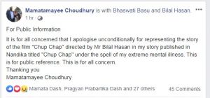 ବିବାଦ ଘନଉଥିବା ଦେଖି ଶେଷରେ ଲେଖିକା ମମତାମୟୀ ଚୌଧୁରୀ ଆଜି ସଂଧ୍ୟାରେ ନିଜ ଫେସବୁକ ୱାଲରେ ଦୋଷ ସ୍ୱୀକାର କରିଛନ୍ତି । ମାନସିକ ଅବସାଦରେ ଥିବା ଅବସରରେ ସର୍ଟଫିଲ୍ମ ‘ଚୁପଚାପ’ର କାହାଣୀର ଛାୟାରେ ସେ ଏହି ଗପଟି ଲେଖିଥିବାରୁ ନିସର୍ତ୍ତ କ୍ଷମାପ୍ରାର୍ଥନା କରିଛନ୍ତି ।