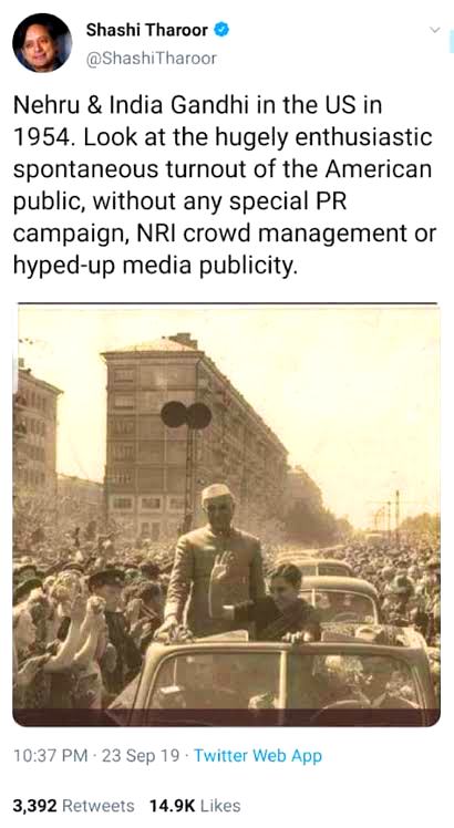 ଏହି ଫଟୋରେ ସେ ଲେଖିଛନ୍ତି ଯେ, ବିନା ସୂଚନାରେ ନେହେରୁ ଏବଂ ଇନ୍ଦିରାଙ୍କୁ କିପରି ଆମେରିକାରେ ପ୍ରବାସୀ ଭାରତୀୟମାନେ ଉଚ୍ଛ୍ୱସିତ ଅଭିନନ୍ଦନ ଦେଉଛନ୍ତି ତାହା ଦେଖନ୍ତୁ । ମାତ୍ର ଇନ୍ଦିରା ଙ୍କ ବଦଳରେ ଶଶୀ ଭୂଲ ବଶତଃ ଇଣ୍ଡିଆ ଲେଖିଛନ୍ତି ।