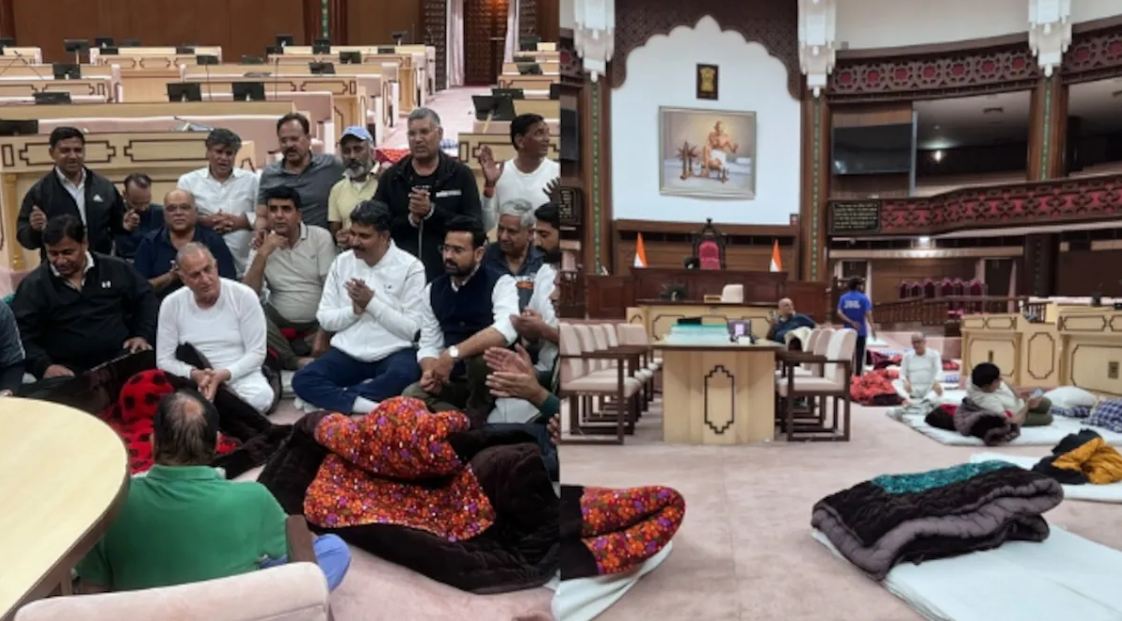 ଗତକାଲି ଏଭଳି ହାଇଡ୍ରାମା ରାଜସ୍ଥାନ ବିଧାନସଭାରେ ଦେଖିବାକୁ ମିଳିଥିବା ବେଳେ, ହୋହଲ୍ଲା ମଧ୍ୟରେ ଗୃହକୁ ମୁଲତବି ରଖିଥିଲେ ବାଚସ୍ପତି । ଆଉ ହଟ୍ଟଗୋଳ ପାଇଁ ୬ ଜଣ କଂଗ୍ରେସ ବିଧାୟକଙ୍କୁ ନିଲମ୍ବିତ କରାଯାଇଛି । ଯେଉଁଥିରେ ରାଜସ୍ଥାନ ପିସିସି ସଭାପତି ଗୋବିନ୍ଦ ସିଂହ ଡୋଟାସରା ମଧ୍ୟ ସାମିଲ ଅଛନ୍ତି । ଏହାପରେ ତକିଆ କମ୍ବଳ ଧରି ବିଧାନସଭାରେ ପହଞ୍ଚି ଯାଇଥିଲେ କଂଗ୍ରେସ ବିଧାୟକ । ଆଉ ରାତିସାରା ବିଧାନସଭା ଭିତରେ ହାଇଡ୍ରାମା ଜାରି ରହିଥିଲା । ରାତିସାରା କଂଗ୍ରେସ ବିଧାୟକ ମାନେ ପ୍ରତିବାଦ ଜାରି ରଖିଥିବା ବେଳେ, କେତେବେଳେ ଭଜନ ଏବଂ କୀର୍ତ୍ତନ ଗାଉଥିବାର ଦୃଶ୍ୟ ସାମ୍ନାକୁ ଆସିଥିଲା ତ ଆଉ କେତେବେଳେ ଭିନ୍ନ ଭିନ୍ନ ସ୍ଥାନରେ ଶୋଇଥିବାର ମଧ୍ୟ ଦେଖାଦେଇଥିଲା । ଆଉ ଏହି ପ୍ରତିବାଦର ଗୋଟିଏ ଦାବି ରହିଥିଲା ଯେ, ସେମାନଙ୍କ ନିଲମ୍ବନ ପ୍ରତ୍ୟାହାର କରାଯାଉ ।