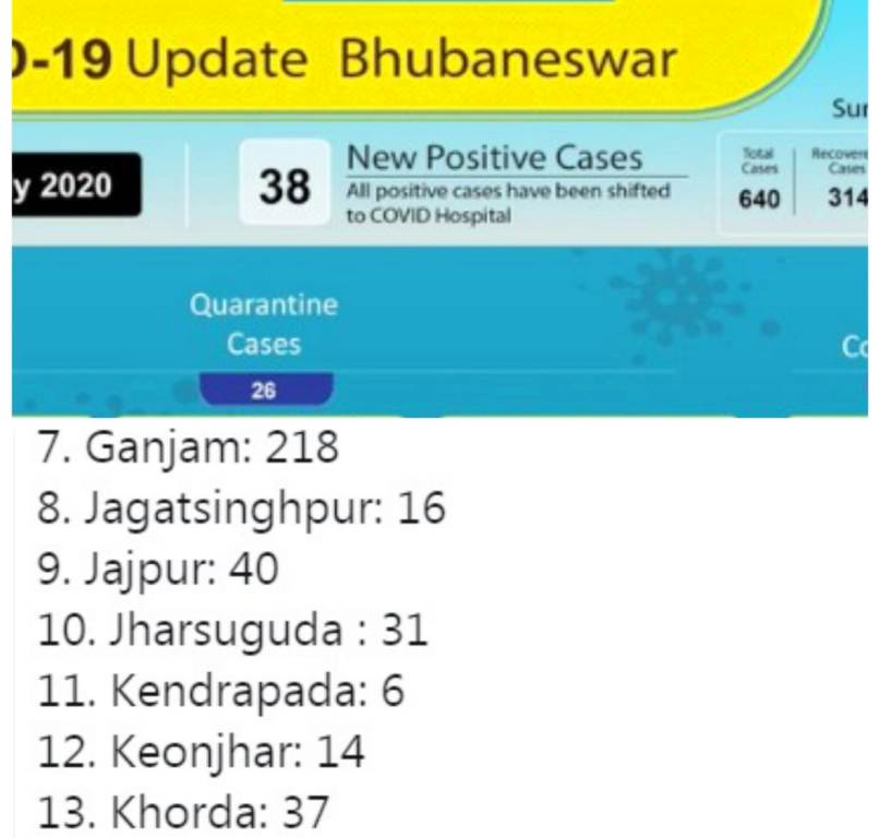 ସ୍ୱାସ୍ଥ୍ୟ ବିଭାଗର ସୂଚନା ଅନୁସାରେ ଖୋର୍ଦ୍ଧା ଜିଲ୍ଲାରେ ଆଜି ୩୭ ଜଣ କରୋନା ଆକ୍ରାନ୍ତ ଚିହ୍ନଟ ହୋଇଛନ୍ତି । ଯଦି ପୁରା ଖୋର୍ଦ୍ଧା ଜିଲ୍ଲାରୁ ୩୭ ଜଣ ଆକ୍ରାନ୍ତ ଚିହ୍ନଟ ହୋଇଛନ୍ତି, ତେବେ କେବଳ ଭୁବନେଶ୍ୱରରୁ କିଭଳି ୩୮ ପଜିଟିଭ ଆସିଲେ । ସ୍ୱାସ୍ଥ୍ୟ ବିଭାଗ ଓ ବିଏମସି ତଥ୍ୟ ମଧ୍ୟରେ ତାଳମେଳ ରହୁନଥିବାରୁ ସନ୍ଦେହ ସୃଷ୍ଟି ହେଉଛି ।