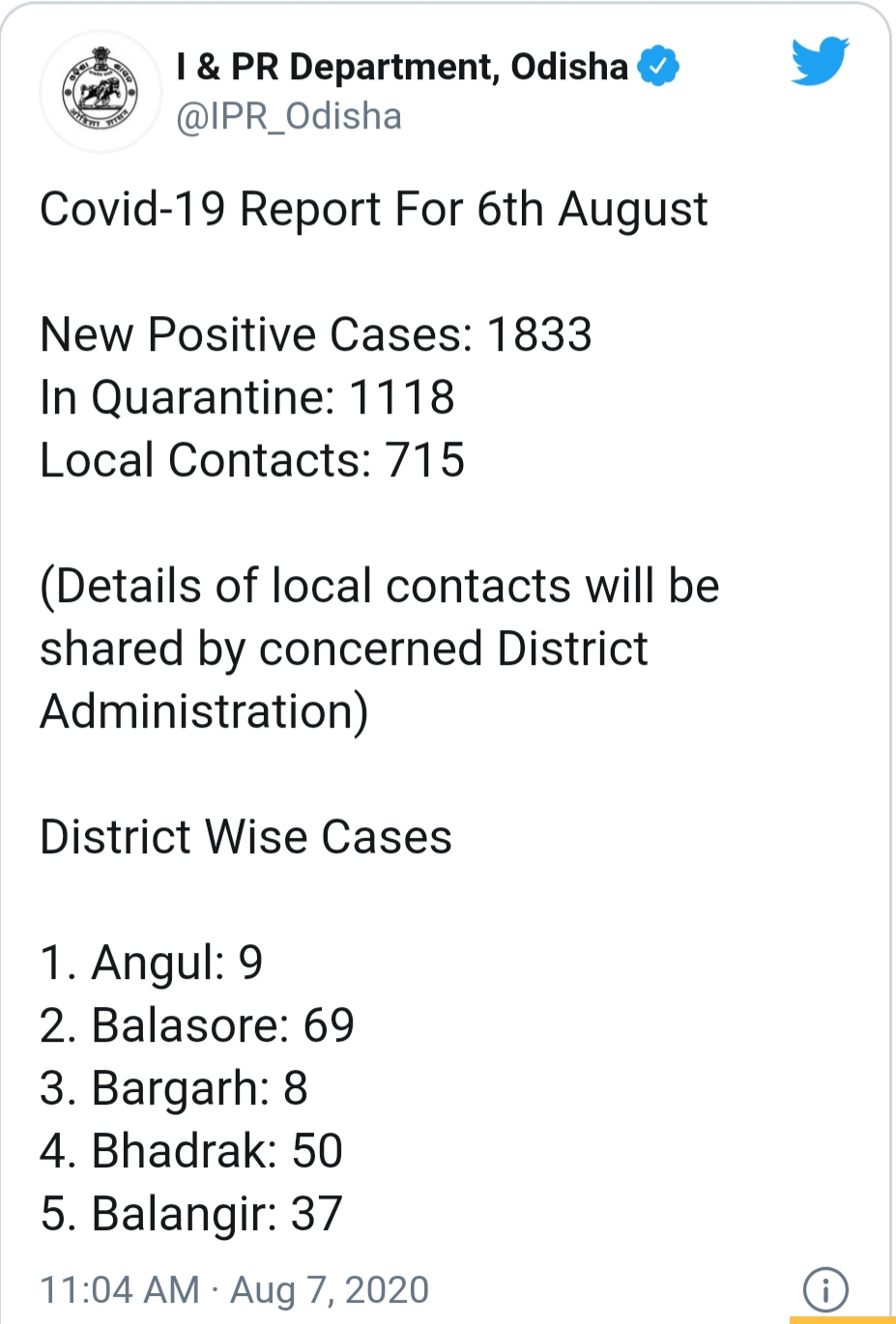 ଆଜି ଚିହ୍ନଟ ଆକ୍ରାନ୍ତଙ୍କ ମଧ୍ୟରେ କ୍ବାରେଣ୍ଟାଇନ୍ କେନ୍ଦ୍ରରୁ ୧୧୧୮ ଜଣ ଚିହ୍ନଟ ହୋଇଥିବାବେଳେ ୭୧୫ ଲୋକାଲ କେସ୍ ରହିଛି।