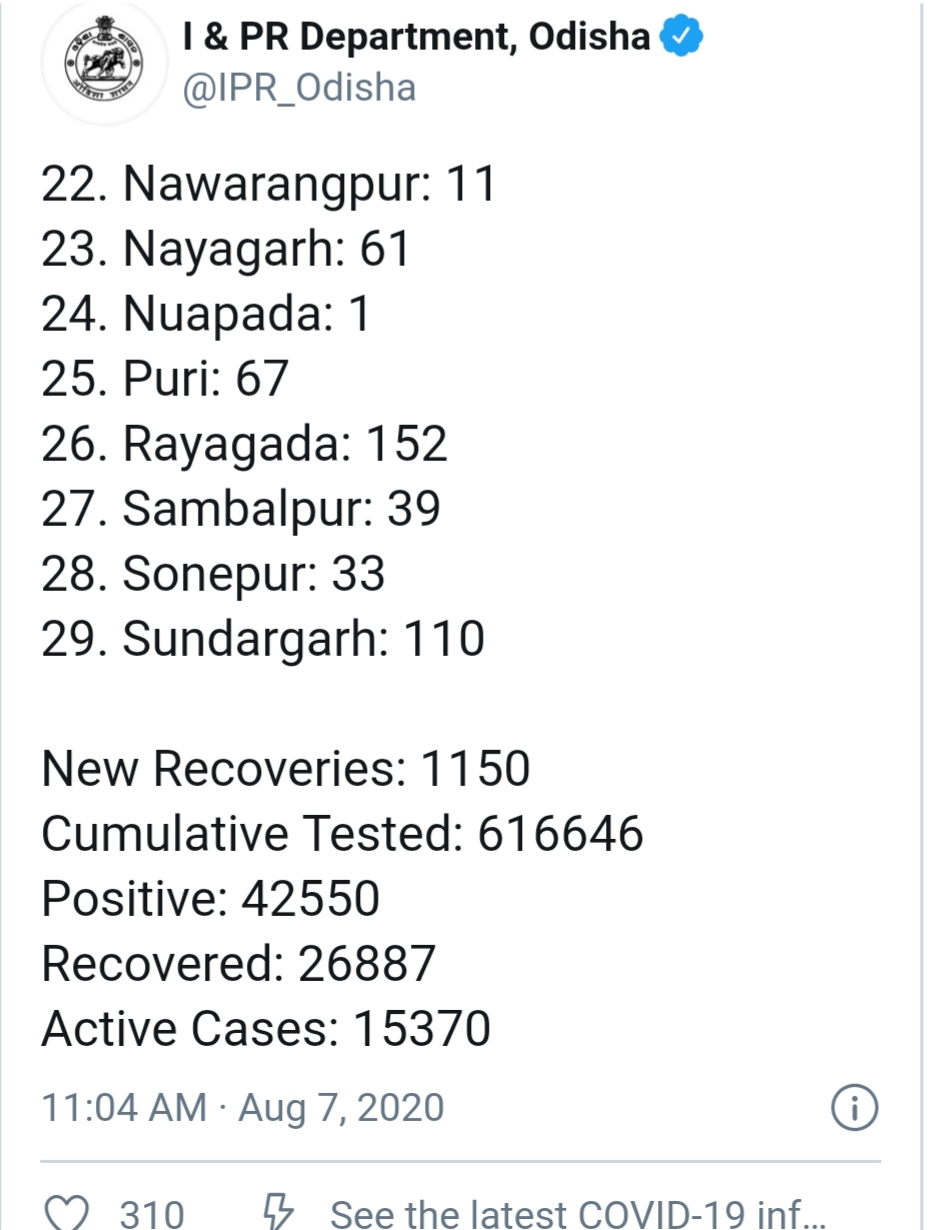 ଓଡିଶାରେ ମୋଟ୍ ଆକ୍ରାନ୍ତଙ୍କ ସଂଖ୍ୟା ୪୨୫୫୦ ରେ ପହଞ୍ଚିଛି । ସେଥିମଧ୍ୟରେ ୧୫୩୭୦ ଟି ସକ୍ରିୟ ମାମଲା ରହିଛି । ଆଉ ୧୧୫୦ ନୂଆ ଆରୋଗ୍ୟଙ୍କ ସହ ମୋଟ୍ ୨୬୮୮୭ ରେ ପହଞ୍ଚିଛି ମୋଟ ସୁସ୍ଥ ସଂଖ୍ୟା।