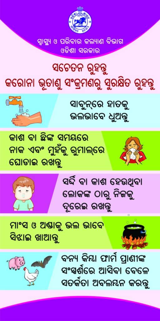 କରୋନା ଭୂତାଣୁ ସଂକ୍ରମିତ ହେବା ପୂର୍ବରୁ ଓଡ଼ିଶା ସରକାରଙ୍କ ସ୍ୱାସ୍ଥ୍ୟ ଓ ପରିବାର କଲ୍ୟାଣ ବିଭାଗ ପକ୍ଷରୁ ବିଭିନ୍ନ ମାଧ୍ୟମରେ ଜନସାଧାରଣଙ୍କୁ ସଚେଚନ କରୁଛନ୍ତି । ବିଭିନ୍ନ ପ୍ରକାର ପ୍ରତିଶେଧାତ୍ମକ କାର୍ଯ୍ୟାନୁଷ୍ଠାନ ଗ୍ରହଣ କରିବା ସହିତ ବିମାନ ବନ୍ଦର ଓ ଡ଼ାକ୍ତରଖାନାରେ ଯାଞ୍ଚ ପ୍ରକ୍ରିୟା ଜାରି ରଖିଛନ୍ତି ।