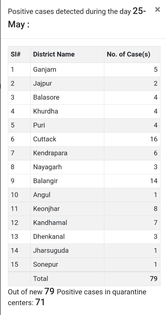 ଚିହ୍ନଟ ୭୯ ଆକ୍ରାନ୍ତଙ୍କ ମଧ୍ୟରୁ ୭୧ ଜଣ କ୍ୱାରେଣ୍ଟାଇନରେ ଥିବା ବେଳେ ୪ ଜଣ ହୋମ କ୍ୱାରେଣ୍ଟାଇନରେ ଥିବା ବେଳେ ୮ ଜଣ ସ୍ଥାନୀୟ ବାସିନ୍ଦା ହୋଇଥିବା ସ୍ୱାସ୍ଥ୍ୟ ବିଭାଗ ପକ୍ଷରୁ ସୂଚନା ମିଳିଛି ।