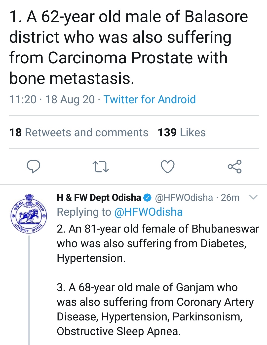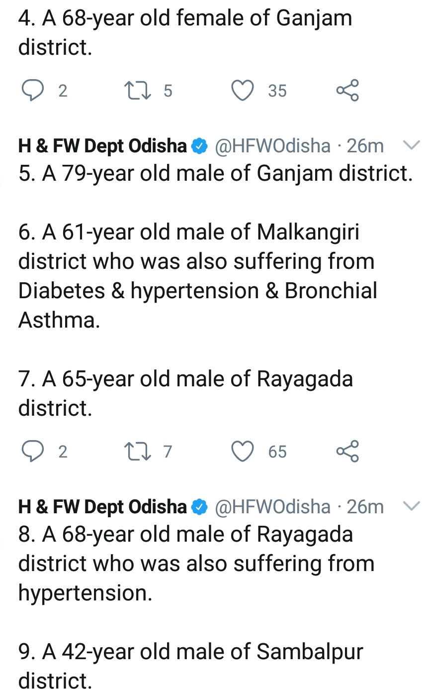 ସ୍ୱାସ୍ଥ୍ୟ ବିଭାଗର ସୂଚନାନୁସାରେ, ବାଲେଶ୍ୱରରୁ ୧, ଭୁବନେଶ୍ୱରରୁ ୧, ଗଞ୍ଜାମ ଜିଲ୍ଲାରୁ ୩, ମାଲକାନଗିରିରୁ ୧, ରାୟଗଡାରୁ ୨ ଓ ସମ୍ବଲପୁରରୁ ଜଣେ କରୋନା ବ୍ୟକ୍ତିଙ୍କ ମୃତ୍ୟୁ ଘଟିଛି ।