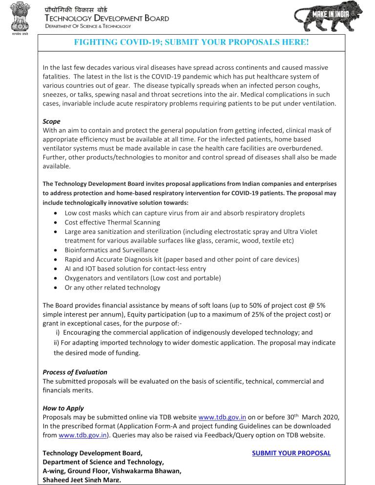 ଦରଖାସ୍ତ ଆହ୍ୱାନକାରୀ କମ୍ପାନୀଗୁଡିକ ନିରୀକ୍ଷଣ ଯନ୍ତ୍ର ଓ ଜୌବସୂଚନା ପ୍ରଦାନ କଲା ଭଳି ସଂରଜାମ ନିର୍ମାଣ ତଥା ବିକଶିତ କରିବାକୁ ଟେକ୍ନୋଲଜି ଡେଭଲପମେଣ୍ଟ ବୋର୍ଡ (TDB) ପ୍ରସ୍ତାବ ଦେଇଛି । ତା ଛଡା (AI) ଓ IoT ଜରିଆରେ କିଭଳି ସ୍ପର୍ଶବିହୀନ ପରୀକ୍ଷଣ ବ୍ୟବସ୍ଥା, ମନିଟରିଂ ଓ କୋଭିଡ୍-୧୯କୁ ବ୍ୟାପିବାରେ ରୋକାଯାଇପାରିବ, ତାହାର ସମାଧାନ ବାହାର କରିବାକୁ ପ୍ରସ୍ତାବ ଦିଆଯାଇଛି ।ମାର୍ଚ୍ଚ ୩୦ ସୁଦ୍ଧା ସମସ୍ତ ଭାରତୀୟ କମ୍ପାନୀ ଦରଖାସ୍ତ ଦାଖଲ କରିବାକୁ ଅନୁରୋଧ କରାଯାଇଛି ।