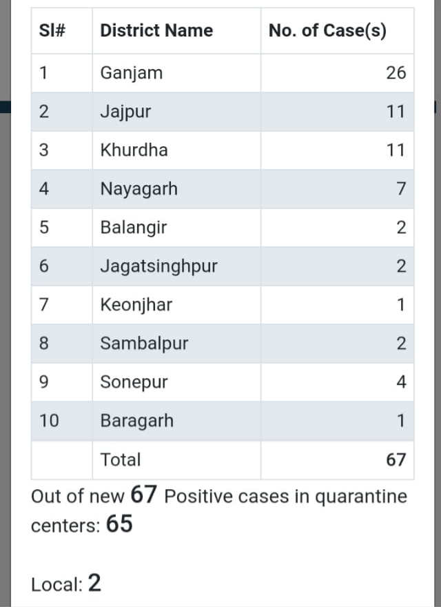 ଚିହ୍ନଟ ୬୭ ଆକ୍ରାନ୍ତଙ୍କ ମଧ୍ୟରୁ ୬୫ ଜଣ କ୍ୱାରେଣ୍ଟାଇନରେ ଥିବା ବେଳେ ୨ ଜଣ ସ୍ଥାନୀୟ ବାସିନ୍ଦା ହୋଇଥିବା ସ୍ୱାସ୍ଥ୍ୟ ବିଭାଗ ପକ୍ଷରୁ ସୂଚନା ମିଳିଛି ।