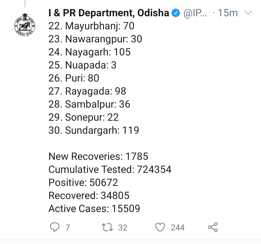 ଓଡିଶାରେ ମୋଟ୍ ଆକ୍ରାନ୍ତଙ୍କ ସଂଖ୍ୟା ୫୦୬୭୨ ରେ ପହଞ୍ଚିଛି । ସେଥିମଧ୍ୟରେ ୧୫୫୦୯ ଟି ସକ୍ରିୟ ମାମଲା ରହିଥିବା ବେଳେ ମୋଟ୍ ୩୪୮୦୫ ଜଣ ଆରୋଗ୍ୟ ଲାଭ କରିଛନ୍ତି ।