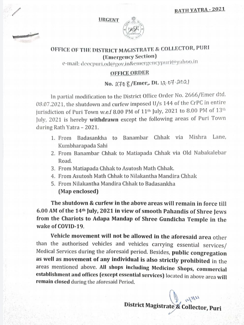 ଏହି ନିର୍ଦ୍ଦିଷ୍ଟ ଅଞ୍ଚଳରେ କାଲି ସକାଳ ୬ଟା ଭିତରେ ସମସ୍ତ ଦୋକାନ ଓ ବଜାର, ଔଷଧ ଦୋକାନ, ବାଣିଜ୍ୟିକ ପ୍ରତିଷ୍ଠାନ, କାର୍ୟ୍ୟାଳୟ ବନ୍ଦ ରହିବ । ସାଧାରଣ ଲୋକଙ୍କ ଯାଆସ ଉପରେ କଟକଣା ଜାରି କରାଯାଇଛି । କେବଳ ସ୍ୱୀକୃତିପ୍ରାପ୍ତ ଓ ଅତ୍ୟାବଶ୍ୟକୀୟ ସାମଗ୍ରୀ ପରିବହନ କରୁଥିବା ଗାଡି ବ୍ୟତୀତ ଅନ୍ୟ ଗାଡି ଯାଆସ ଉପରେ କଟକଣା ରହିବ । ସହଯୋଗ କରିବା ପାଇଁ ପୁରୀବାସୀଙ୍କୁ ଅନୁରୋଧ କରିଛି ଜିଲ୍ଲା ପ୍ରଶାସନ ।