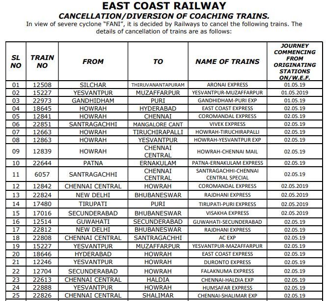 ଭୁବନେଶ୍ୱର: ଓଡ଼ିଶା ଉପକୂଳରେ ଭୟଙ୍କର ସାମୁଦ୍ରିକ ଝଡ଼ ‘ଫନି’ର ପ୍ରଭାବକୁ ଦୃଷ୍ଟିରେ ରଖି ଇଷ୍ଟ କୋଷ୍ଟ ରେଲୱେ ପକ୍ଷରୁ କେତେକ ଟ୍ରେନର ଚଳାଚଳ ବାତିଲ୍ କରିଯାଇଛି । ଇଷ୍ଟକୋଷ୍ଟ ରେଳବାଇ ପକ୍ଷରୁ ଇତିମଧ୍ୟରେ ୧୦୩ ଟି ଟ୍ରେନକୁ ବାତିଲ୍ କରାଯାଇଥିବାର ଘୋଷଣା ହୋଇଛି ।