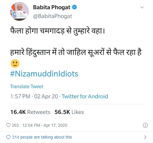 — Babita Phogat (@BabitaPhogat) April 17, 2020