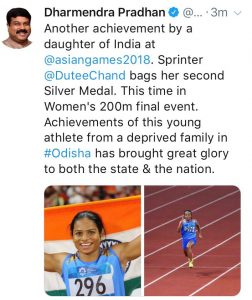 ନୂଆଦିଲ୍ଲୀ : ଏସୀୟ କ୍ରୀଡାରେ ଦୂତିଙ୍କ ସଫଳତାରେ ସାରା ଭାରତରୁ ଶୁଭେଚ୍ଛାର ସୁଅ ଛୁଟିବାରେ ଲାଗିଛି । କେନ୍ଦ୍ରମନ୍ତ୍ରୀ ଧର୍ମେନ୍ଦ୍ର ପ୍ରଧାନ ମଧ୍ୟ ଟ୍ୱିଟ କରି ଦୂତିଙ୍କୁ ଅଭିନନ୍ଦନ ଜଣାଇଛନ୍ତି ।