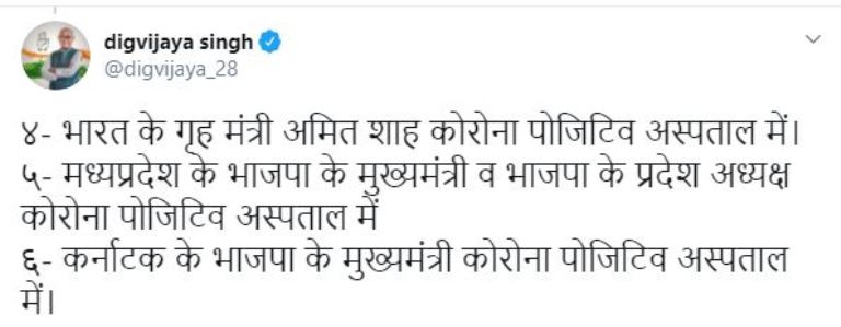 ସେହିପରି ଅନ୍ୟ ଟ୍ୱିଟରେ ଦିଗବିଜୟ ଲେଖିଛନ୍ତି, କେନ୍ଦ୍ର ଗୃହମନ୍ତ୍ରୀ ଅମତି ଶାହ କୋଭିଡ୍ ପଜିଟିଭ୍ ଚିହ୍ନଟ ହୋଇଛନ୍ତି । ବିଜେପି ଶାସିତ ମଧ୍ୟପ୍ରଦେଶ ମୁଖ୍ୟମନ୍ତ୍ରୀ ଶିବରାଜ ସିଂହ ଚୌହ୍ୱାନଙ୍କୁ କରୋନା ସଂକ୍ରମିତ ହୋଇଥିବା ବେଳେ କର୍ଣ୍ଣାଟକରେ ବିଜେପିର ମୁଖ୍ୟମନ୍ତ୍ରୀ ବି. ଏସ୍. ୟେଦିୟୁରପ୍ପାଙ୍କ କୋଭିଡ୍ ରିପୋର୍ଟ ପଜିଟିଭ୍ ।