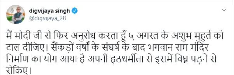ଦିଗବିଜୟ କହିଛନ୍ତି, ଭୂମି ପୂଜନର ଅଶୁଭ ମୁହୂର୍ତ୍ତ ଯୋଗୁ ଏଭଳି ଘଟଣା ଘଟୁଛି । ଏଥିପାଇଁ ଅଗଷ୍ଟ ୫ ତାରିଖର ଅଶୁଭ ବେଳାକୁ ହଟାଇବା ପାଇଁ ପ୍ରଧାନମନ୍ତ୍ରୀଙ୍କୁ ଅନୁରୋଧ କରିଛନ୍ତି ଦିଗବିଜୟ ସିଂହ ।