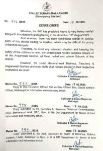 ମାଲକାନଗିରି: ମାଲକାନଗିରି ଜିଲ୍ଲାରେ କାଲି ସମସ୍ତ ସରକାରୀ ଏବଂ ବେସରକାରୀ ସ୍କୁଲ ଛୁଟି ରହିବ । ଅଙ୍ଗନବାଡ଼ି ସହ ସ୍କୁଲ ଛୁଟି ଘୋଷଣା କଲେ ଜିଲ୍ଲାପାଳ ସୋମେଶ କୁମାର ଉପାଧ୍ୟାୟ । ଆସନ୍ତାକାଲି ତଥା ଅଗଷ୍ଟ ୧୮ ତାରିଖରେ ଅତିପ୍ରବଳ ବର୍ଷା ନେଇ ମାଲକାନଗିରି ଜିଲ୍ଲାକୁ ୱାର୍ଣ୍ଣିଂ ଜାରି ହୋଇଥିବାରୁ ଏପରି ନିଷ୍ପତ୍ତି ହୋଇଛି ।