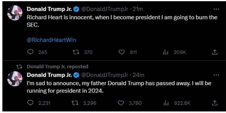 ହ୍ୟାକର ଜୁନିଅର ଟ୍ରମ୍ପଙ୍କ ଆକାଉଣ୍ଟରେ ଲେଖିଛନ୍ତି, , ମୋତେ ଏହା କହିବାକୁ ଦୁଃଖ ଲାଗୁଛି ଯେ, ମୋର ପିତା ଡୋନାଲ୍ଡ ଟ୍ରମ୍ପ ଆଉ ନାହାନ୍ତି । ୨୦୨୪ ରାଷ୍ଟ୍ରପତି ନିର୍ବାଚନରେ ମୁଁ ଅଂଶ ଗ୍ରହଣ କରିବାକୁ ଯାଉଛି । ଏଥିରେ ଆହୁରି ଲେଖା ଯାଇଛି ନର୍ଥ କୋରିଆକୁ ଧୁଳିସାତ କରି ଦିଆଯିବ । ଏସବୁ ଦେଖି ଜଣାପଡିଛି ଯେ କେହି ଏହି ଆକାଉଣ୍ଟକୁ ହ୍ୟାକ କରି ନେଇଛି ।