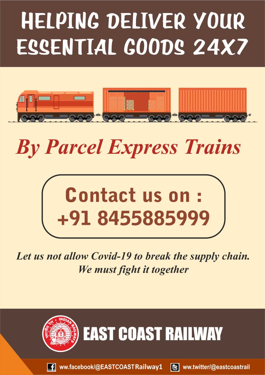 ଏପରିକି ପୂର୍ବତଟ ରେଳପଥ ପକ୍ଷରୁ ଅବିରାମ ଗତିରେ ଅତ୍ୟାବଶ୍ୟକୀୟ ସାମଗ୍ରୀ ଦେଶର ବିଭିନ୍ନ କୋଣ ଅନୁକୋଣରେ ପହଞ୍ଚାଇବା ନିମନ୍ତେ ଏହାର ପରିସୀମା ମଧ୍ୟରେ ଟାଇମ୍ ଟେବୁଲ୍ ପାର୍ସଲ ଏକ୍ସପ୍ରେସ୍ ଚଳାଚଳ ନିଶ୍ଚିତ କରାଯାଇଛି।