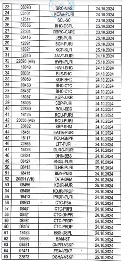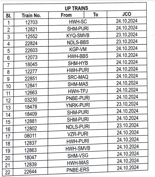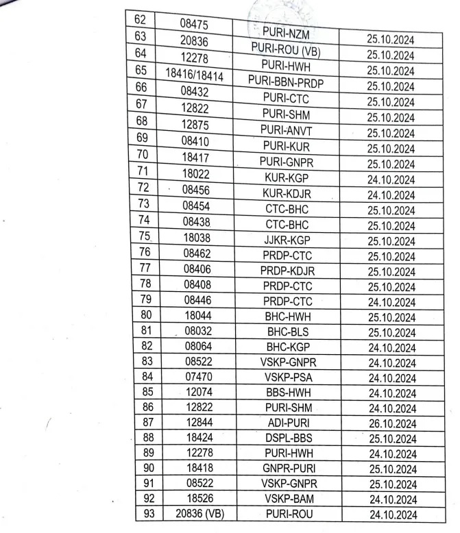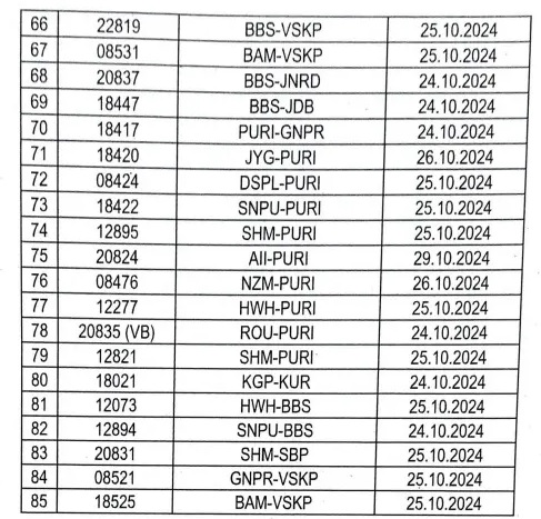 ମଙ୍ଗଳବାର ଦିନ ରେଳବାଇର ପ୍ରେସ ବିଜ୍ଞପ୍ତି ଅନୁଯାୟୀ, ଉଭୟ ଅପ୍ ଏବଂ ଡାଉନ୍ ଟ୍ରାକରେ ଏହି ଟ୍ରେନର ଚଳାଚଳ ଅକ୍ଟୋବର ୨୩ରୁ ୨୫ ତାରିଖ ଅର୍ଥାତ୍ ୩ ଦିନ ପର୍ଯ୍ୟନ୍ତ ସ୍ଥଗିତ ରହିବ। ୮୫ ଟି ଟ୍ରେନ୍ ବାତିଲ ହୋଇଥିବାବେଳେ ୯୩ ଡାଉନ୍ ଟ୍ରେନ୍ ତିନି ଦିନ ମଧ୍ୟରେ ଟ୍ରାକରୁ ଯିବ ବୋଲି ପ୍ରକାଶ କରିଛି।