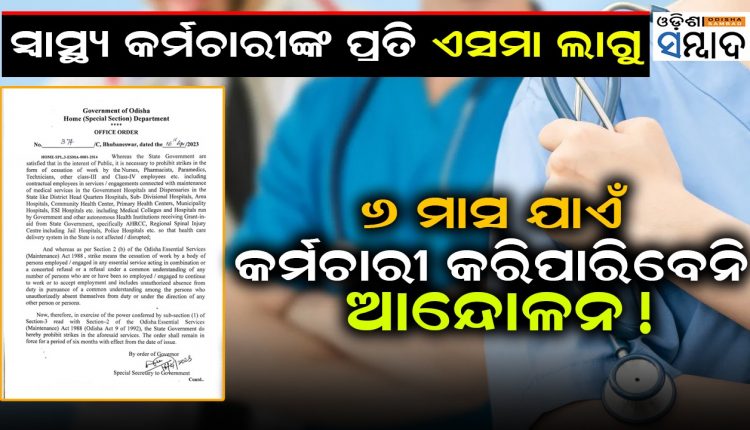 ଭୁବନେଶ୍ୱର : ରାଜ୍ୟ ସରକାରଙ୍କ ଗୃହ ବିଭାଗ ପକ୍ଷରୁ ସ୍ବାସ୍ଥ୍ୟ ସେବାରେ ନିୟୋଜିତ କର୍ମଚାରୀଙ୍କ ପ୍ରତି ଲାଗୁ ହୋଇଛି ହେଲା ଓଡ଼ିଶା ଇସେନ୍ସିଆଲ ସର୍ଭିସ ମେଣ୍ଟେନାନ୍ସ ଆକ୍ଟ(ଏସମା)। ନର୍ସ, ଫାର୍ମାସିଷ୍ଟ, ପାରାମେଡିକ, ଟେକ୍ନିସିଆନଙ୍କ ପ୍ରତି ରବିବାର ପ୍ରକାଶିତ ବିଜ୍ଞପ୍ତିରେ ଏସମା ଲାଗୁ କରିଛନ୍ତି ରାଜ୍ୟ ସରକାର। ନିର୍ଦ୍ଦେଶନାମା ଅନୁସାରେ ୬ମାସ ପର୍ଯ୍ଯନ୍ତ ଏହି ଆଦେଶ ବଳବତ୍ତର ରହିବ। ଏସମା ଲାଗୁ ହୋଇଥିବାରୁ ଏହି ସମୟରେ ଡାକ୍ତରଖାନାର କୌଣସି କର୍ମଚାରୀ ଆନ୍ଦୋଳନ କରି ପାରିବେ ନାହିଁ। ନର୍ସ, ଫାର୍ମାସିଷ୍ଟ, ପାରାମେଡିକ, ଟେକ୍ନିସିଆନଙ୍କ ସମେତ ଅନ୍ୟ ତୃତୀୟ ଶ୍ରେଣୀ ଓ ଚତୁର୍ଥ ଶ୍ରେଣୀ କର୍ମଚାରୀଙ୍କ ପ୍ରତି ମଧ୍ୟ ଏସମା ଲାଗୁ ହୋଇଛି।