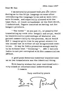 ୨୮, ଜୁନ, ୧୯୫୭ ମସିହାରେ ଓଡିଆ ପ୍ରକାଶକ ପ୍ରଫୁଲ୍ଲ କୁମାର ଦାସଙ୍କୁ ଏମିତି ମର୍ମରେ ଏଇ ଚିଠିଟି ଲେଖିଥିଲେ ଇଂରାଜୀ କବିତାର କିମ୍ବଦନ୍ତୀପୁରୁଷ ଏଜରା ପାଉଣ୍ଡ। ଘଟଣାଟି ପୂରା ଗୋଟେ ରୂପକଥା ଭଳି ମନେ ହେଉଛି। ୧୯୫୭ ମସିହାରେ ଜଣେ ଓଡିଆ ପ୍ରକାଶକ ଏଜରା ପାଉଣ୍ଡଙ୍କ କବିତା ବହିକୁ ଓଡିଆ ଓ ବଙ୍ଗଳା ଭାଷାରେ ଅନୁବାଦ କରି ଛାପିବାକୁ ଚାହୁଁଛନ୍ତି। ତେବେ ଓଡିଆ ବହିଟି “ଏଜରା ପାଉଣ୍ଡ କବିତା” ଶୀର୍ଷକରେ ୧୯୫୮ରେ ପ୍ରକାଶିତ ହୋଇଛି। ପାଉଣ୍ଡଙ୍କ କବିତାସବୁକୁ ଅନୁବାଦ କରିଛନ୍ତି ଜ୍ଞାନୀନ୍ଦ୍ର ବର୍ମା ଓ ବହିଟିର ମୁଖବନ୍ଧ ଲେଖିଛନ୍ତି ନୋବେଲ ପୁରସ୍କାର ବିଜେତା କବି ଟି.ଏସ.ଇଲିୟଟ।
