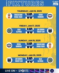 ଏହି ଲିଗ୍ ରେ ୪ଟି ଦଳ ଅଂଶ ଗ୍ରହଣ କରିବେ । ୨୬ରେ ଲିଗ୍ର ଫାଇନାଲ ମ୍ୟାଚ ଖେଳାଯିବ । ତେବେ ରାଉରକେଲାରେ ଖେଳାଯିବ ୨ଟି ମ୍ୟାଚ । ବିର୍ସା ମୁଣ୍ଡା ଷ୍ଟାଡିୟମରେ ଆସନ୍ତା ୧୭ ତାରିଖ ଶୁକ୍ରବାର ଦିଲ୍ଲୀ ପାଇପର୍ସ ଓ ସରୁମା ହକି କ୍ଲବ ଏବଂ ୧୯ ତାରିଖ ରବିବାର ଓଡିଶା ଓ୍ବାରିୟର୍ସ ଓ ବେଙ୍ଗଲ ଟାଇଗର୍ସ ମୁକାବିଲା କରିବେ । ବାକି ୧୧ଟି ମ୍ୟାଚ ରାଞ୍ଚିରେ ଖେଳାଯିବ ।