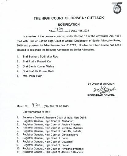 ବରିଷ୍ଠ ଆଇନଜୀବୀ ପଦୋନ୍ନତି ପାଇଥିବା ଆଇନଜୀବୀମାନେ ହେଲେ ସୁଙ୍କୁରୁ ସୁଧାକର ରାଓ, ରୁଦ୍ର ପ୍ରସାଦ କର, ସମୀର କୁମାର ମିଶ୍ର, ପ୍ରଫୁଲ୍ଲ କୁମାର ରଥ ଏବଂ ପମି ରଥ ।