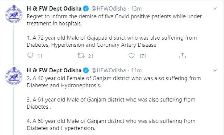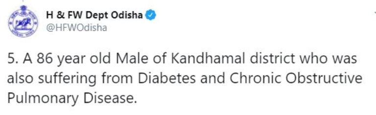 ମୃତକଙ୍କ ଭିତରେ ଚାରି ଜଣ ପୁରୁଷ ଥିବା ବେଳେ ଜଣେ ମହିଳା ଅଛନ୍ତି । କନ୍ଧମାଳ ଜିଲ୍ଲାରେ କରୋନାରେ ଗଡ଼ିଲା ପ୍ରଥମ ମୁଣ୍ଡ । ମଧୁମେହ ଓ ଫୁସଫୁସ ରୋଗରେ ପୀଡ଼ିତ ଜଣେ ୮୬ ବର୍ଷୀୟ ବୃଦ୍ଧ ମୃତ୍ୟୁବରଣ କରିଛନ୍ତି ।