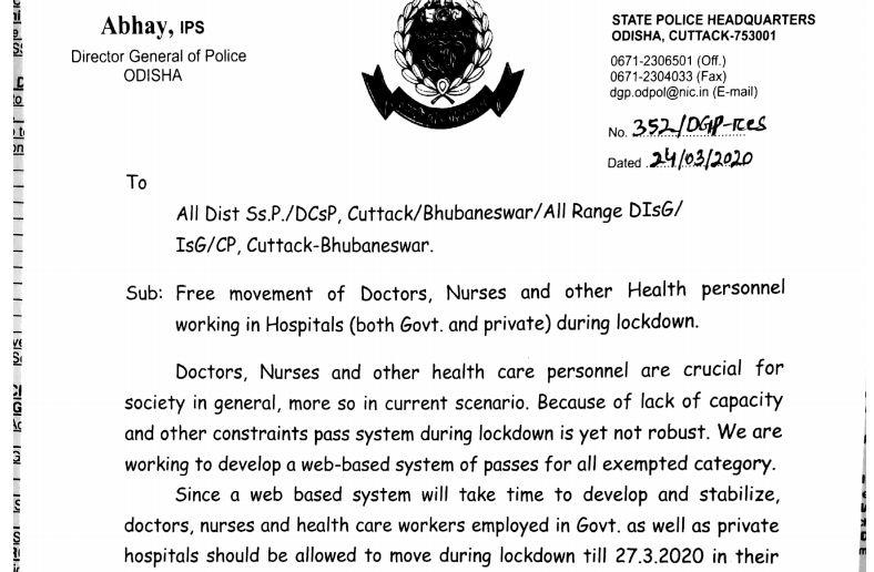 ଲକ୍ ଡାଉନ ବେଳେ ଡାକ୍ତର ଓ ନର୍ସଙ୍କ ଉପରେ କୌଣସି କଟକଣା ରହିବ ନାହିଁ । ସେମାନେ ମୁକ୍ତ ଭାବେ ଚଲାବୁଲା କରିପାରିବେ ।