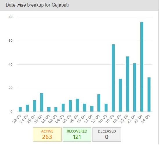 ମେ ୨୨ ତାରିଖରେ ଗଜପତି ଜିଲ୍ଲାରୁ ପ୍ରଥମ ପଜିଟିଭ୍ କେସ୍ ବାହାରିଥିଲା । ମାସେ ଭିତରେ ସଂକ୍ରମିତଙ୍କ ସଂଖ୍ୟା ୩ ଶହ ଟପିଗଲା । ରାଜ୍ୟରେ ସର୍ବାଧିକ କରୋନା ପ୍ରଭାବିତ ଜିଲ୍ଲାର ପଞ୍ଚମ ସ୍ଥାନରେ ରହିଛି ଗଜପତି ।