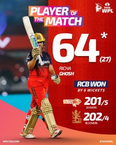 ମହିଳା ପ୍ରିମିୟର ଲିଗ ଇତିହାସରେ ଆର୍ସିବି ସର୍ବାଧିକ ସ୍କୋର ପିଛା କରିଛି। ଆର୍ସିବିକୁ ଜିତିବା ପାଇଁ ୨୦୨ ରନ କରିବାକୁ ପଡିଥିଲା। ଆରସିବି ସହଜରେ ଏହି ସଫଳତା ହାସଲ କରିଥିଲା। ପୂର୍ବରୁ, ୨୦୨୪ରେ ମୁମ୍ବାଇ ଦଳ ଗୁଜରାଟ ବିପକ୍ଷରେ ମ୍ୟାଚ୍ରେ ୧୯୧ ରନ ପିଛା କରି ରେକର୍ଡର ଅଧିକାରୀ ହୋଇଥିଲା ।