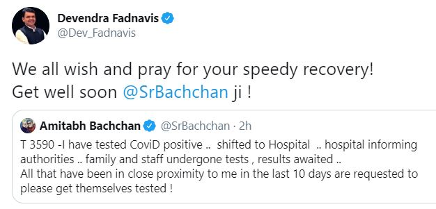 ମହାରାଷ୍ଟ୍ରର ପୂର୍ବତନ ମୁଖ୍ୟମନ୍ତ୍ରୀ ଦେବେନ୍ଦ୍ର ଫଡନବିସ୍ ଟ୍ୱିଟ୍ କରିଛନ୍ତି, ଆମେ ସମସ୍ତେ ଆପଣ ଶୀଘ୍ର ଭଲ ହୋଇ ଯାଆନ୍ତୁ ସେଇ କାମନା କରୁଛି ।