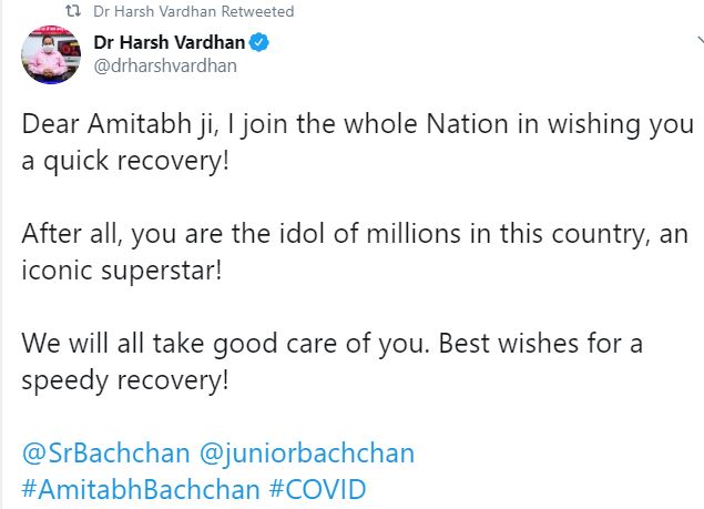 କେନ୍ଦ୍ର ମନ୍ତ୍ରୀ ହର୍ଷବର୍ଦ୍ଧନ କହିଛନ୍ତି, ପ୍ରିୟ ଅମିତାଭ ଜୀ, ମୁଁ ଆପଣଙ୍କ ଶୀଘ୍ର ଆରୋଗ୍ୟ କାମନା କରୁଛି । ଆପଣ ଦେଶର ଲକ୍ଷ ଲକ୍ଷ ଲୋକଙ୍କ ପାଇଁ ପ୍ରେରଣାର ଉତ୍ସ ଅଟନ୍ତି ।