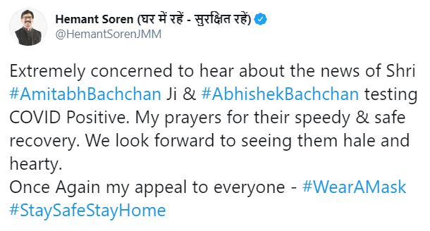 ଝାଡ଼ଖଣ୍ଡ ମୁଖ୍ୟମନ୍ତ୍ରୀ ହେମନ୍ତ ସୋରେନ୍ ଟ୍ୱିଟ୍ କରିଛନ୍ତି, ଅମିତାଭ ବଚ୍ଚନ ଓ ଅଭିଷେକ ବଚ୍ଚନ କରୋନା ସଂକ୍ରମିତ ହୋଇଥିବା ଖବର ଶୁଣି ମୁଁ ଚିନ୍ତିତ । ଦ୍ରୁତ ଆରୋଗ୍ୟ କାମନା କରୁଛି ।