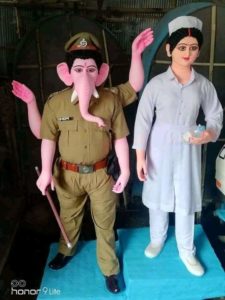 ଏଠାରେ ମାଁ ଦୁର୍ଗାଙ୍କୁ କରୋନାଭାଇରସ୍ ସହିତ ଲଢ଼ୁଥିବା ଡାକ୍ତର ଭାବରେ ଚିତ୍ରଣ କରାଯାଇଛି