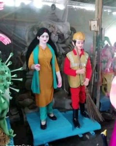 ଏହି ଉପସ୍ଥାପନାରେ ଦୁର୍ଗା ଏବଂ ଲକ୍ଷ୍ମୀ, ସରସ୍ୱତୀ, କାର୍ତ୍ତିକ ଏବଂ ଗଣେଶଙ୍କ ଆଦି ଦେବତାଙ୍କୁ କରୋନା ଯୋଦ୍ଧା ଭାବେ ଚିତ୍ରଣ କରାଯାଇଛି ଯେଉଁମାନେ କରୋନାଭାଇରସ୍ ମହାମାରୀ ମଧ୍ୟରେ ଜୀବନ ବଞ୍ଚାଇବାରେ ଅବଦାନ ଦେଇ ଦେବୀ ଦେବତା ତୁଲ୍ୟ କାର୍ଯ୍ୟ କରୁଛନ୍ତି ।