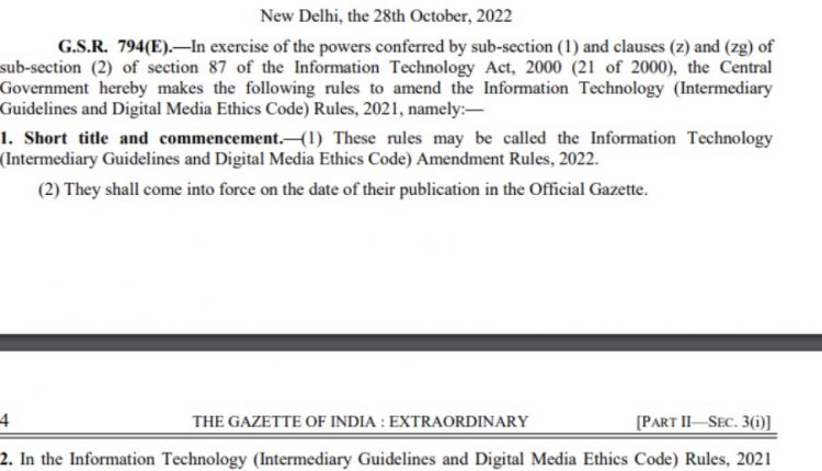 Ministry of Electronics and Information Technology, Government of India releases the Information Technology (Intermediary Guidelines and Digital Media Ethics Code) Amendment Rules, 2022 pic.twitter.com/m2fRfyCh7B