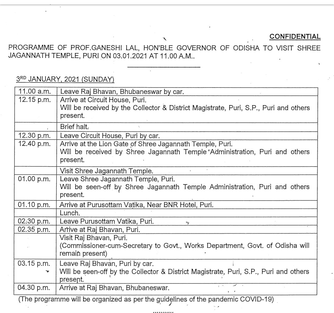 ରାଜ୍ୟପାଳ ପାଖାପାଖି ୨୦ ମିନିଟ ମନ୍ଦିର ଭିତରେ ରହିବେ । ମହାପ୍ରଭୁଙ୍କ ଦର୍ଶନ ସାରି ରାଜ୍ୟପାଳ ଯିବା ପୁରୀ ରାଜଭବନ । ସେଠାରୁ ୩ଟା ୧୫ରେ ଭୁବନେଶ୍ୱର ଅଭିମୁଖେ ବାହାରିବେ ରାଜ୍ୟପାଳ ପ୍ରଫେସର ଗଣେଶୀ ଲାଲ ।