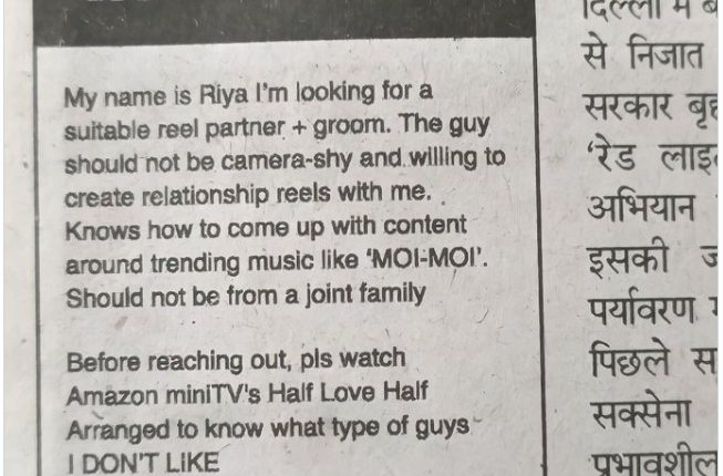 ରିୟା ନାମକ ଜଣେ ଯୁବତୀ ନିଜ ପାଇଁ ଜଣେ ଜୀବନସାଥୀ ଖୋଜୁଛନ୍ତି । ସେଥିଲାଗି ସେ ରିଲ୍ସ ପାର୍ଟନର ଖୋଜୁଛନ୍ତି । ବିବାହ ପାଇଁ ଦେଇଥିବା ବିଜ୍ଞାପନରେ ସେ ଏହି କଥାକୁ ସ୍ପଷ୍ଟ ଭାବେ ଉଲ୍ଲେଖ କରିଛନ୍ତି । କାରଣ ତାଙ୍କ ଭବିଷ୍ୟତ ବର ପାଇଁ ବିଜ୍ଞାପନରେ ସେ ଚାହୁଁଥିବା କଥା ସବୁ ଅଦ୍ଭୁତ ଥିଲା । ସେ ସ୍ପଷ୍ଟ ଭାବରେ ଲେଖିଛନ୍ତି ଯେ ସେ ଜଣେ ସାଥୀ ଖୋଜୁଛନ୍ତି । ଯିଏକି କ୍ୟାମେରା ସାମ୍ନାରେ ସହଜ ଅନୁଭବ କରୁଥିବେ । ଯାହାଫଳରେ ଭବିଷ୍ୟତରେ ସେ ତାଙ୍କ ସହ ମିଶି ରିଲ୍ସ ବନାଇ ପାରିବେ । ଆହୁରି ଉଲ୍ଲେଖ କରିଛନ୍ତି ଯେ, ତାଙ୍କ ଜୀବନ ସାଥୀ ପ୍ରିମିୟର ପ୍ରୋ ଜାଣିଥିବା ଦରକାର । ଫଳରେ ସେ ଯେପରି ଭବିଷ୍ୟତରେ ଯୁବତୀଙ୍କୁ ରିଲ୍ସ ଓ ପୋଷ୍ଟ୍କୁ ଏଡିଟ୍ କରିପାରିବେ । ଏହି ବିଜ୍ଞାପନ ତୁରନ୍ତ ଭାଇରାଲ ହୋଇ ବହୁ ଲୋକଙ୍କ ଦୃଷ୍ଟି ଆକର୍ଷଣ କରିଛି ।