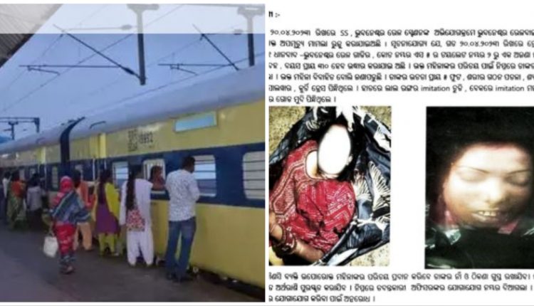 ଗତ ୨୦ ତାରିଖରୁ ଟ୍ରେନ ନମ୍ବର ୦୨୮୩୧ ଧାନବାଦ-ଭୁବନେଶ୍ୱର ଟ୍ରେନର କୋଚ ନମ୍ବର ୫ର ଟଏଲେଟ ନମ୍ବର ୨ରୁ ଅଜଣା ମହିଳାଙ୍କର ମୃତ ଦେହ ଉଦ୍ଧାର କରାଯାଇଥିଲା । ଇତି ମଧ୍ୟରେ ୪ ଦିନ ବିତି ଯାଇଥିଲେ ହେଁ ମୃତା ମହିଳାଙ୍କର ପରିଚୟ ମିଳି ପାରିନାହିଁ । ମହିଳାଙ୍କର ପରିଚୟ ପାଇବା ପାଇଁ ଜିଆରପି ମହିଳାଙ୍କ ଫଟୋ ଜାରି କରିଛି।