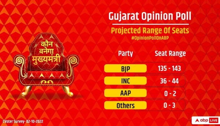 ଗୁଜୁରାଟ ବିଧାନସଭାରେ ୧୮୨ ଆସନ ରହିଛି । ବିଧାନସଭା ନିର୍ବାଚନରେ ଗତ ଥର କଂଗ୍ରେସ ୭୭ ଟି ଆସନ ପାଇଥିଲା । ତେବେ ଏଥର କମ ପାଇବ ବୋଲି ସର୍ଭେରେ ଜଣାପଡିଛି । ମଧ୍ୟ ଗୁଜୁରାଟରେ ୪୫ରୁ ୫୦ ଆସନ ପାଇବ ବିଜେପି । ସୈାରାଷ୍ଟ୍ର ଅଂଚଳରେ ୩୮ରୁ ୪୨ ଆସନ ପାଇବ ବିଜେପି । ଦକ୍ଷିଣ ଗୁଜରାଟରେ ୨୪ ରୁ ୩୧ ଆସନ ପାଇବ ବିଜେପି ।