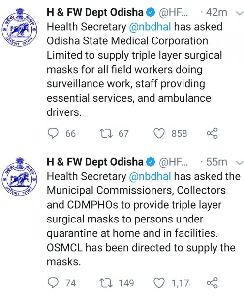 ଏଥି ସହିତ ସେ ଘରେ ଏବଂ ସରକାରୀ ବ୍ୟବସ୍ଥାରେ କ୍ୱାରେଣ୍ଟାଇନରେ ରହିଥିବା ସମସ୍ତ ବ୍ୟକ୍ତିଙ୍କୁ ତିନି ଲେୟର ବିଶିଷ୍ଟ ସର୍ଜିକାଲ ମାସ୍କ ଯୋଗାଇ ଦେବା ପାଇଁ ସବୁ ଜିଲ୍ଲାପାଳ, ମ୍ୟୁନିସିପାଲ କମିଶନର ଓ ସିଡିଏମ୍ପିଏଚ୍ଓମାନଙ୍କୁ ନିର୍ଦ୍ଦେଶ ଦେଇଛନ୍ତି ।