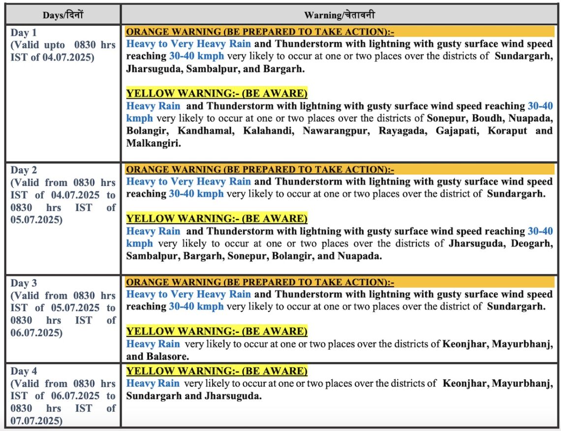 ପାଣିପାଗ ସଂସ୍ଥା ଜୁଲାଇ ୩, ୪ ଓ ୫ରେ ସୁନ୍ଦରଗଡ଼, ସମ୍ବଲପୁର, ଝାରସୁଗୁଡ଼ା, କୋରାପୁଟ, ସୋନପୁର, ବରଗଡ଼, କଳାହାଣ୍ଡି, ମୟୂରଭଞ୍ଜ ଏବଂ କେନ୍ଦୁଝର ଜିଲ୍ଲା ପାଇଁ ଅରେଞ୍ଜ ସତର୍କତା ଜାରି କରିଛି। ଆଗାମୀ ସାତ ଦିନ ମଧ୍ୟରେ ଭୁବନେଶ୍ୱର ଏବଂ କଟକ ଟ୍ୱୀନ ସିଟିରେ ଗୋଟିଏ କିମ୍ବା ଦୁଇଟି ସ୍ଥାନରେ ବର୍ଷା କିମ୍ବା ଝଡ଼ ବର୍ଷା ହେବାର ସମ୍ଭାବନା ରହିଛି।