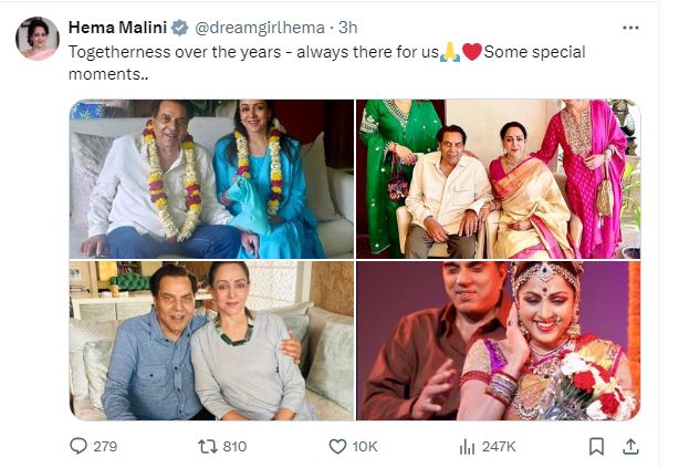 ଧର୍ମେନ୍ଦ୍ରଙ୍କୁ ମନେପକାଇ ସେ ଲଖିଛନ୍ତି ‘ଧରମ ଜୀ… ମୋତେ ବହୁତ ଭଲ ପାଉଥିଲେ।ସେ ଜଣେ ଭଲ ସ୍ବାମୀ , ଆମର ଦୁଇ ଝିଅ, ଇଶା ଏବଂ ଆହାନାଙ୍କ ପାଇଁ ଜଣେ ସ୍ନେହଶୀଳ ପିତା ଥିଲେ, ଜଣେ ବନ୍ଧୁ, ଜଣେ ଦାର୍ଶନିକ, ଜଣେ ମାର୍ଗଦର୍ଶକ, ଜଣେ କବି, ଆଉ ଏପରି ଜଣେ ବ୍ୟକ୍ତି ଯିଏ ମୋର ଆବଶ୍ୟକତା ସମୟରେ ସବୁବେଳେ ମୋ ପାଇଁ ଛିଡ଼ା ହୋଇ ଥିଲେ – ପ୍ରକୃତରେ, ସେ ମୋ ପାଇଁ ସବୁକିଛି ଥିଲେ। ସେ ମୋର ଭଲ ଏବଂ ଖରାପ ସମୟରେ ମୋତେ ସର୍ବଦା ସମର୍ଥନ କରୁଥିଲେ। ତାଙ୍କର ବନ୍ଧୁତ୍ୱପୂର୍ଣ୍ଣ ସ୍ୱଭାବ ଯୋଗୁଁ ସେ ସହଜରେ ମୋ ପରିବାରର ନିକଟତର ହୋଇଗଲେ। ଆଜି ତାଙ୍କର ଅନୁପସ୍ଥିତି ଆମ ସମସ୍ତଙ୍କୁ ଦୁଃଖ ଦେଉଛି । ମୁଁ ଯେଉଁ ବ୍ୟକ୍ତିଗତ କ୍ଷତି ସହିଛି ତାହା ଅବର୍ଣ୍ଣନୀୟ, ଏବଂ ସେ ଯେଉଁ ଶୂନ୍ୟସ୍ଥାନ ଛାଡିଛନ୍ତି ତାହା ମୋ ଜୀବନର ବାକି ସମୟ ପାଇଁ ମୋ ସହିତ ରହିବ’।