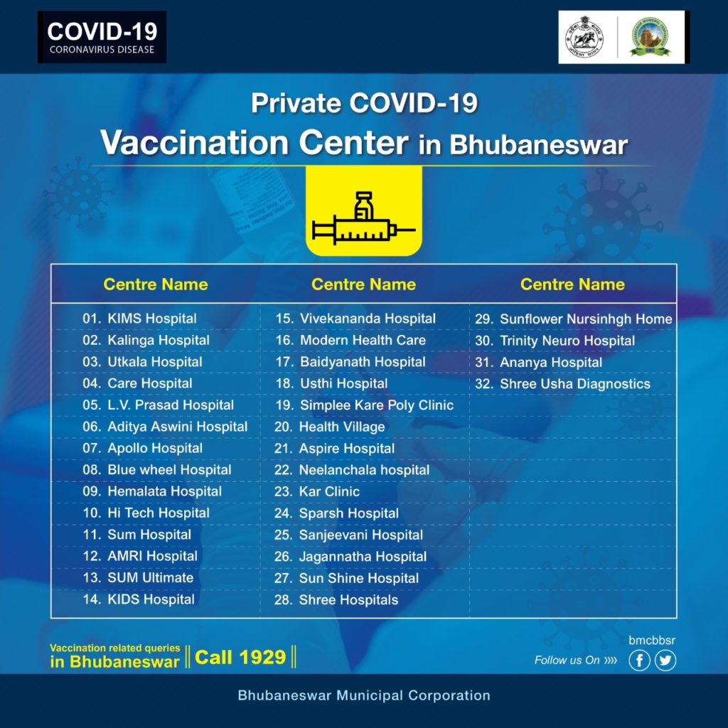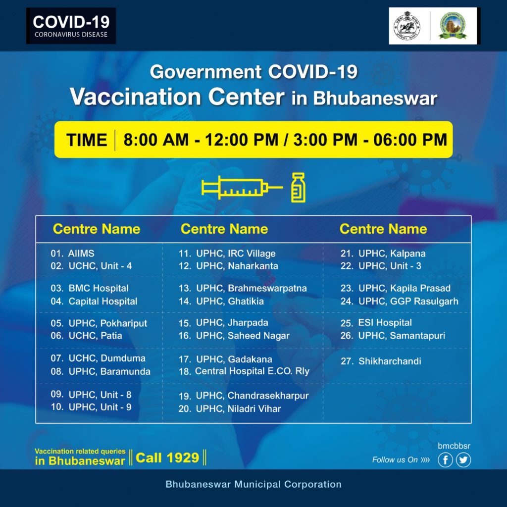 ଭୁବନେଶ୍ୱର: ଭୁବନେଶ୍ୱର ମ୍ୟୁନିସିପାଲିଟି କର୍ପୋରେସନ୍ (ବିଏମସି) ପକ୍ଷରୁ ଭୁବନେଶ୍ୱରର ସରକାରୀ ଓ ବେସରକାରୀ କୋଭିଡ ଟୀକାକରଣ କେନ୍ଦ୍ରର ଏକ ତାଲିକା ଜାରି କରାଯାଇଛି।